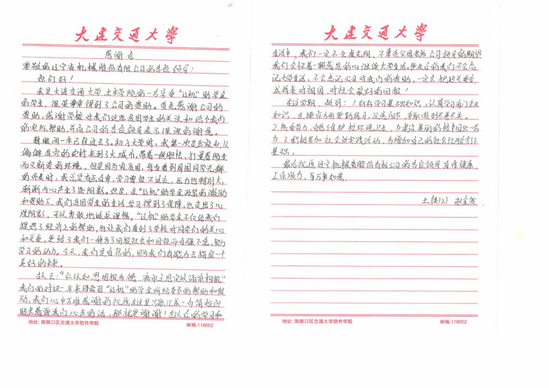 近日,公司收到一封來自大連交通大學的感謝信。寄信👣人是交通大學土木學院一名大二學生,系2012年遼機助學金的獲得者。在信中,他表示:感謝公司的資助,并向公司的各位領導表示深深的謝意。在遼❤️機助學金政策的激勵和資助🛀下,我們貧🎯困學生的生活學習得到了保障,也走出了心裡的陰影,可以勇敢的追求理想,更給了我們一種為了回報社會❗以及國家自強不息、努力學習的動力。