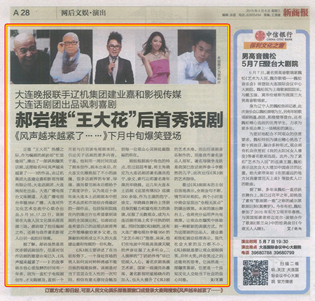 話劇籌備伊始,《大連日報》、《大連晚報》和《新商報》等媒體大篇幅對該話劇進行報道。建業嘉和影視傳媒總經理張虹娟表示,現代社會大家的壓力都不小,《風》劇就是要讓觀衆眉眼俱笑,開懷大笑,并在笑過⭐之後還能有所思考,它雖然是一部爆笑喜劇,但更是一個良知文化人交給當下社會的良心問卷。